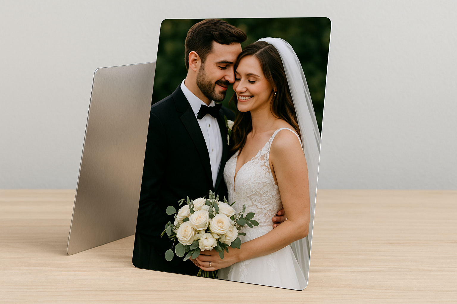 Metal prints give wedding pictures a striking, high-definition appearance. The metallic sheen enhances every color and texture, making your photo pop.